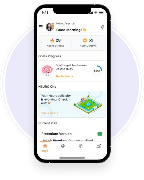 - Gamification experience via Neuropolis city with assessments and habit check-ins