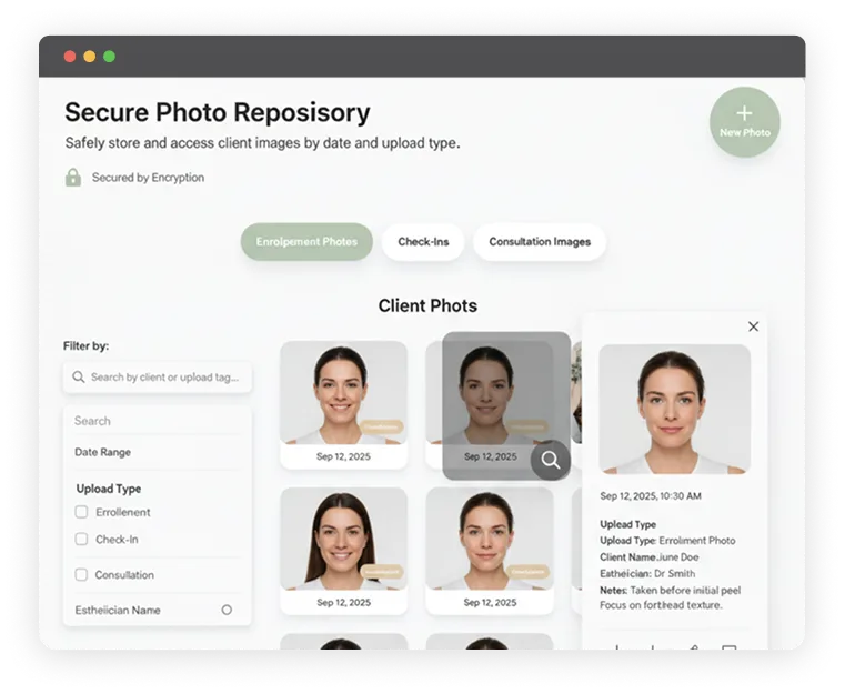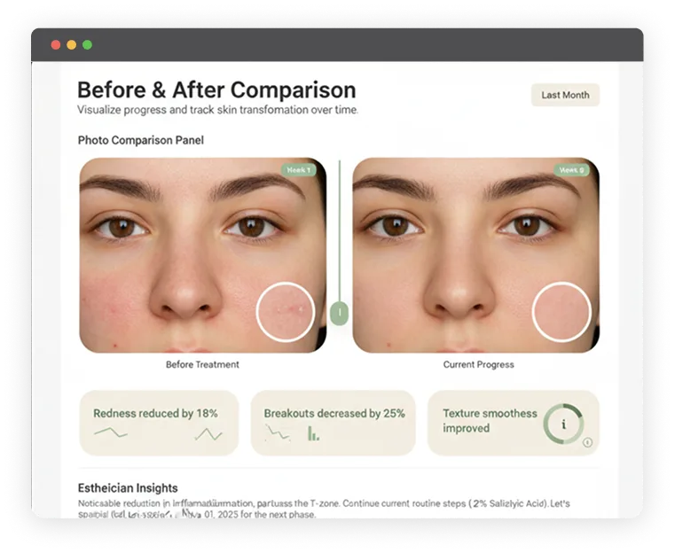 Real-time, date-stamped photos enable clients to visualize progress, build motivation, and help estheticians make data-informed adjustments for improved outcomes.