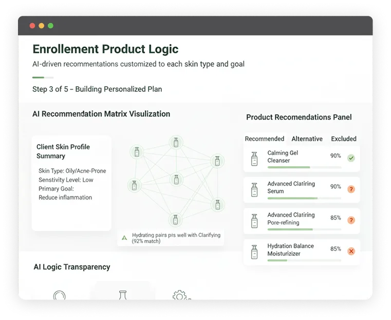 An AI-driven recommendation matrix evaluates over 50 product combinations to deliver personalized treatment plans tailored to each client’s specific skin needs and goals.