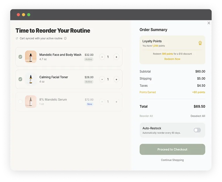 An integrated cart popup automatically populates with products from the current routine, making restocking seamless and preventing treatment gaps.
