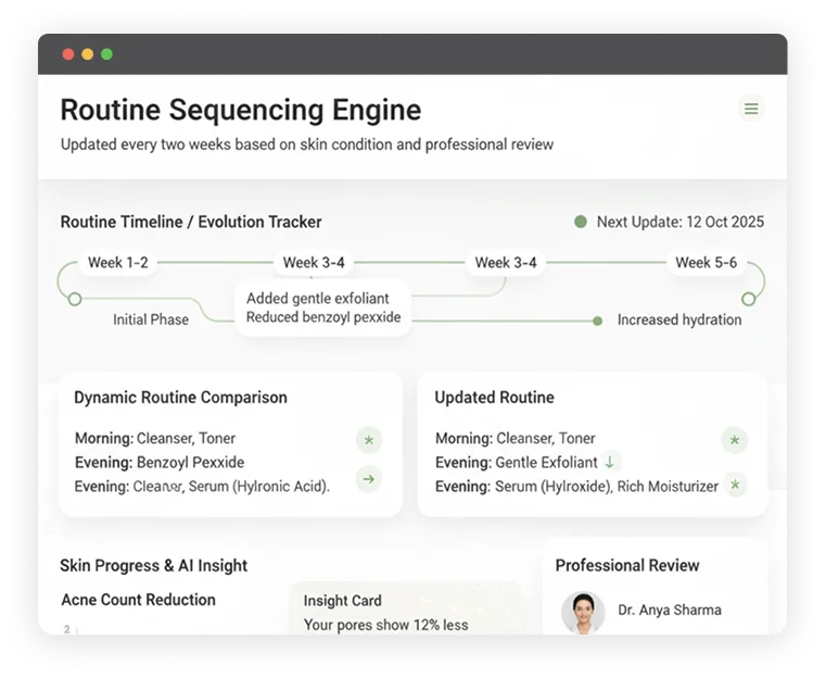 The acne portal updates routines every two weeks based on skin condition and professional review, ensuring each plan evolves as the client’s skin improves, mirroring the flexibility of a virtual skincare consultation.