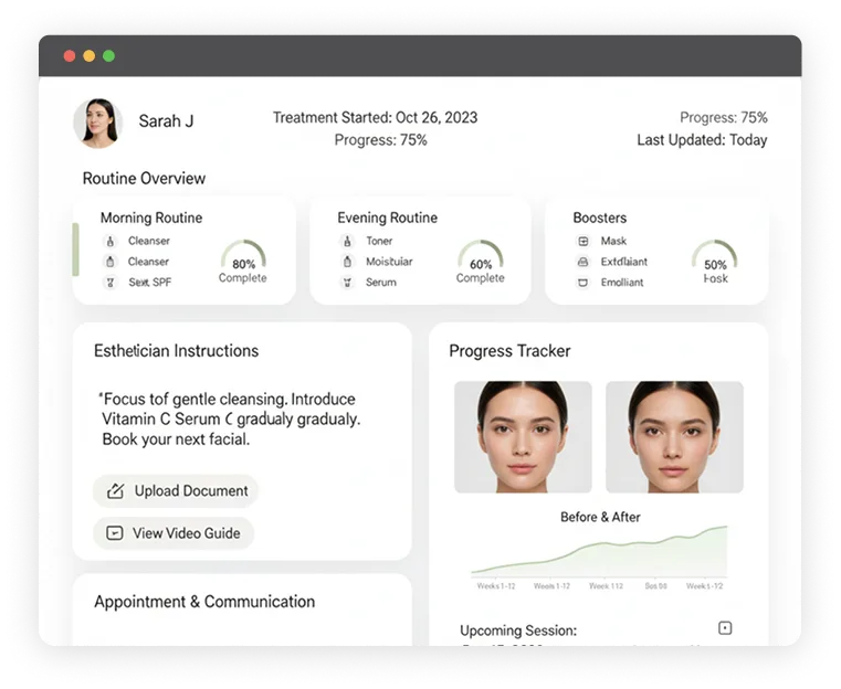 A unified dashboard offers a complete view of skincare routines, esthetician instructions, and progress photos. Clients can follow every step with confidence while tracking visible results over time.