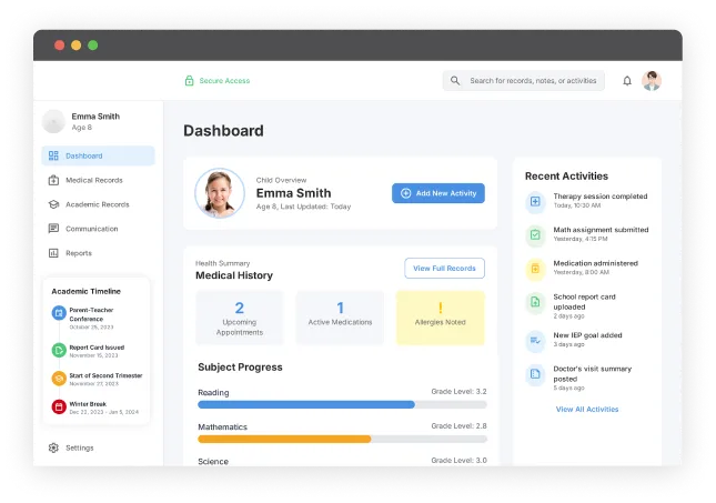Our client envisioned a care coordination platform for children that would facilitate real-time collaboration among parents, teachers, and healthcare professionals. Folio3 Digital Health delivered a HIPAA- and FERPA-compliant cloud-based care coordination platform that centralized health and educational records, enabling caregivers to communicate and set developmental goals. This child-centered care system improved accessibility across institutions and supported vulnerable populations by ensuring holistic care.